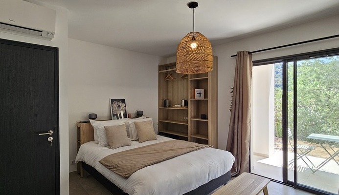 Each room has been designed and decorated with care, and is brightly lit thanks to its large bay windows, with unobstructed views of the mountain or swimming pool. We provide bed linen and towels, and a complimentary courtesy tray. You'll enjoy a private terrace with direct access to your room. For your comfort, all our rooms are air-conditioned. If you arrive late, you can collect your keys directly from a secure box. Each private terrace is equipped with garden furniture, so you can enjoy the outdoors out of sight. Our rooms are not accessible to people with reduced mobility.