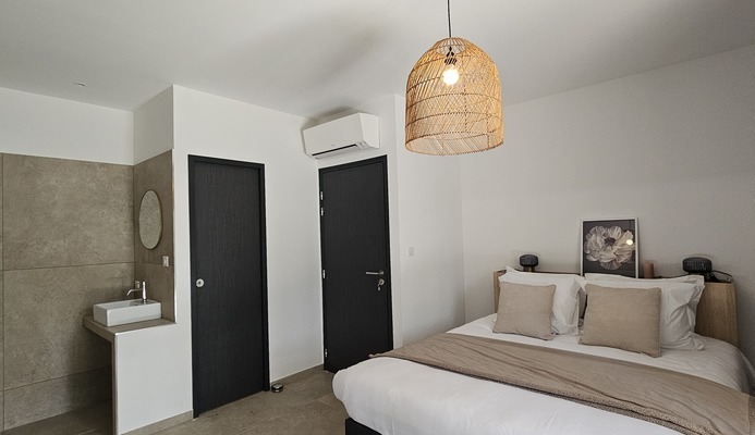 In the shade of the pine... you'll be welcomed by the natural tones of this room, with its king-size bed (160X200), flat-screen TV, TNT, reversible air conditioning, wifi, hairdryer, mini bar, kettle and Nespresso, courtesy tray and large dressing room. The bathroom is open to your room, where you'll find complimentary toiletries.